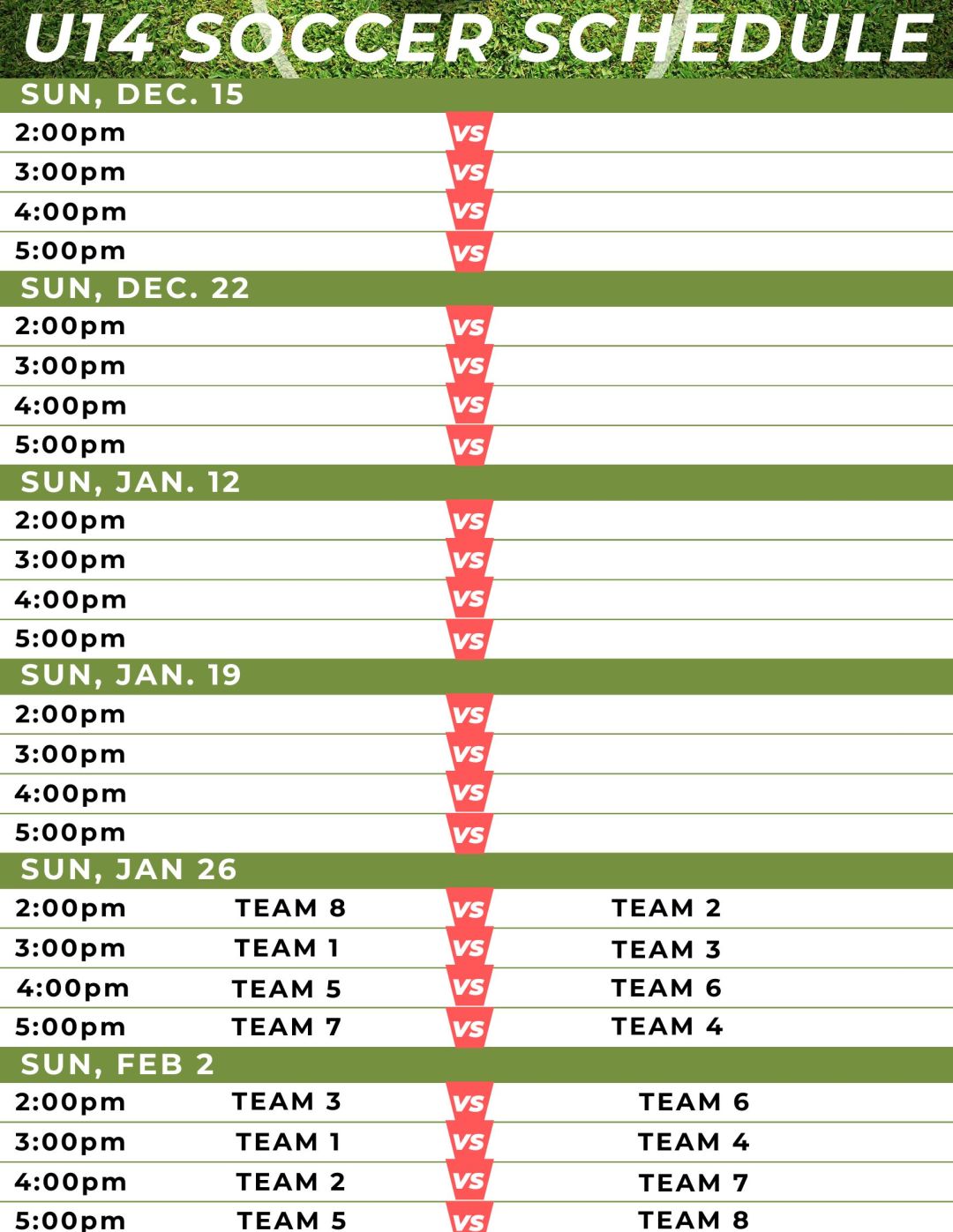 U14 COED – 6V6 Sunday between 2pm-6pm. 10 kids per team