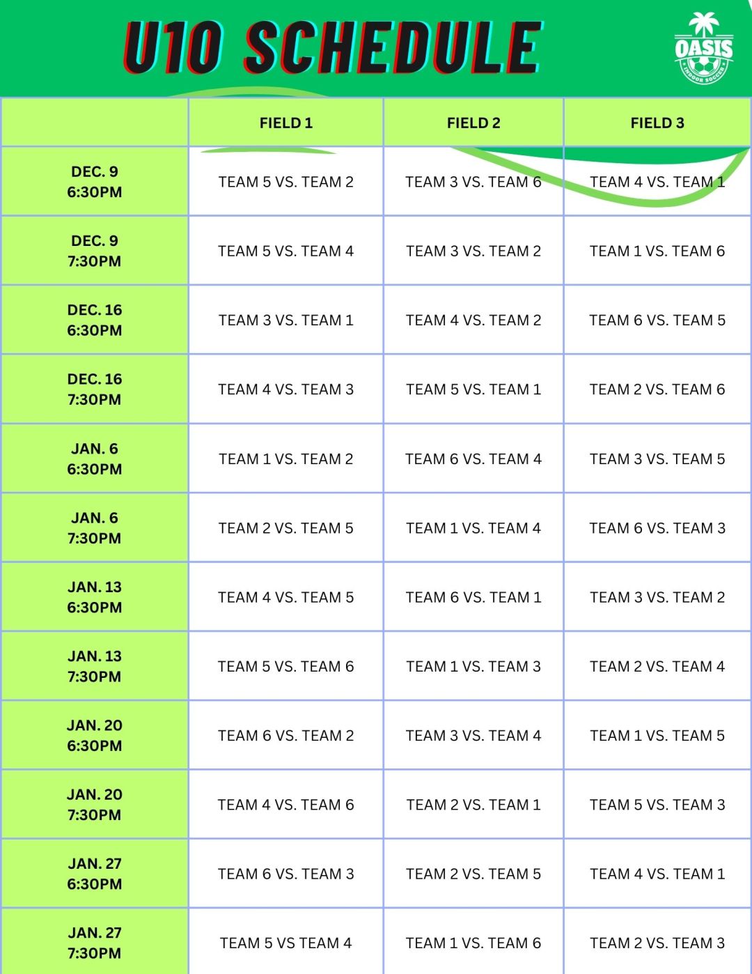 U10 COED – 3V3 Monday nights between 6pm-8pm. 4 kids per team.