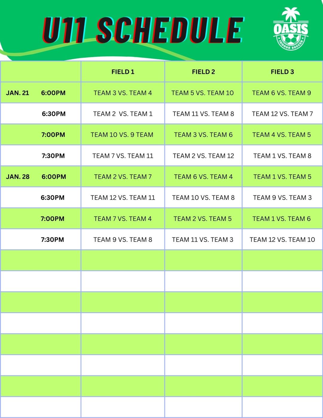 U11 COED – 3V3 Tuesday nights between 6pm-8pm. 4 kids per team