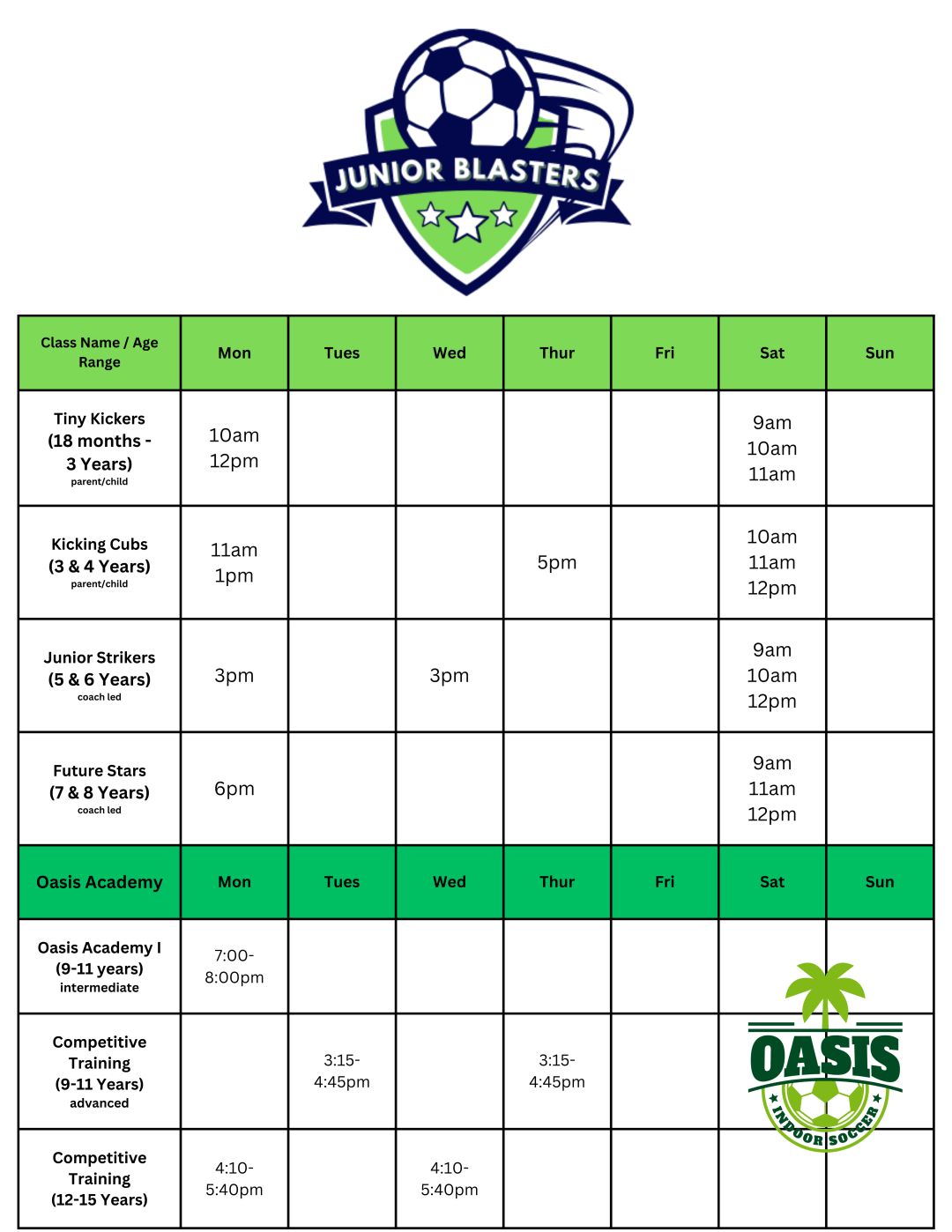 Players should wear comfortable shoes or cleats. Outdoor cleats are OKAY to wear at Oasis Indoor! Shin Guards are suggested for ages 5 and up. Junior Blasters shirts are included in the price and your player will be receiving a shirt. They are not mandatory to wear, but outfitting your child in Junior Blasters garb is a fun way to make your player feel a part of the team.