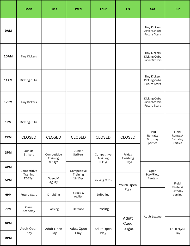 While coaching remains child-centered and fun this curriculum is fundamentals focused and provides game-like situations each week that help solidify learning. Players enjoy 30 minutes of age-appropriate instruction and 20 minutes of small-sided scrimmaging. Classes meet weekly for 50-minutes.
